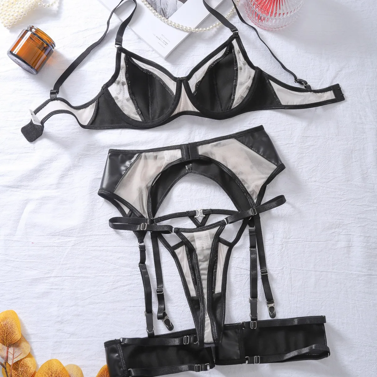 2024 New Complex Craft Leather Splicing Mesh See-Through Sexy Suit Women's Four-Piece Sexy Underwear Set